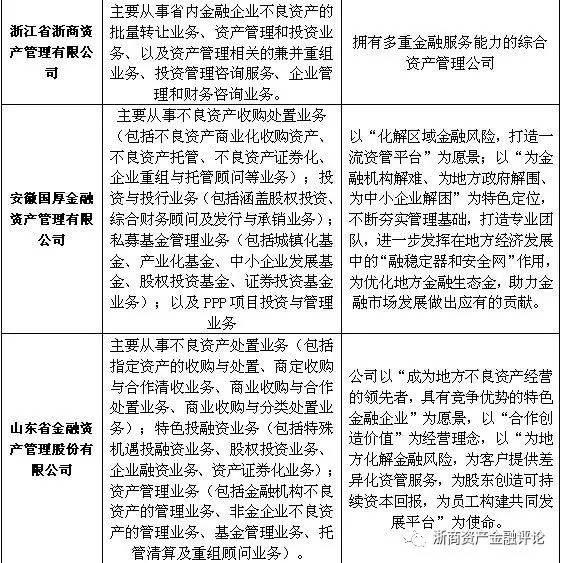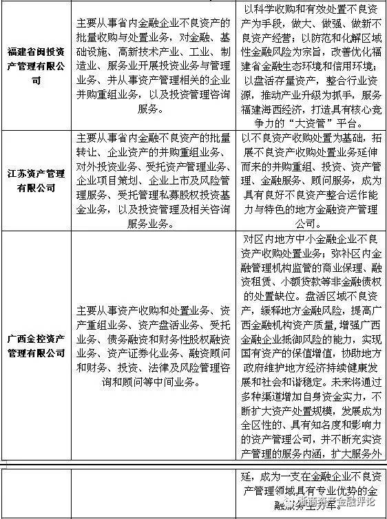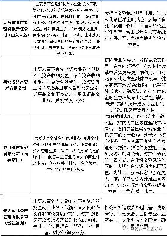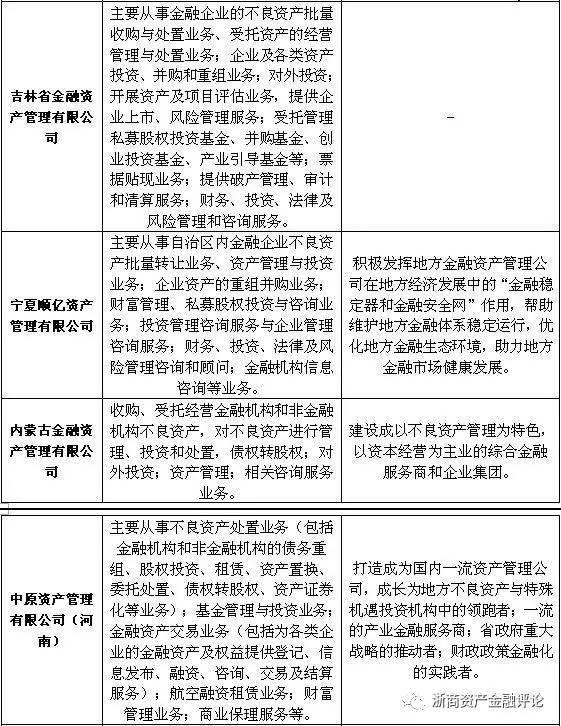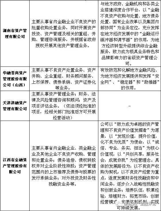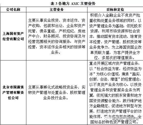 資產(chǎn)管理公司對(duì)不良資產(chǎn)的處置需要運(yùn)用到多種手段,因此,開展相關(guān)業(yè)務(wù)輔佐不良資產(chǎn)的處置就顯得尤為重要。但由于各地方AMC的定位不同,其所開展的主要業(yè)務(wù)也有所差異,例如有些地方AMC將自身定位為地方不良資產(chǎn)的“收集器”,因此主要以收購不良資產(chǎn)業(yè)務(wù)為主;而有些地方AMC則側(cè)重于解決地方政府和國(guó)有企業(yè)的不良資產(chǎn)問題,在開展不良資產(chǎn)業(yè)務(wù)的同時(shí)還開展結(jié)構(gòu)化業(yè)務(wù);還有部分地方AMC以市場(chǎng)化的資金業(yè)務(wù)為主,將自身打造為地方綜合金融服務(wù)平臺(tái)。具體如下表所示: