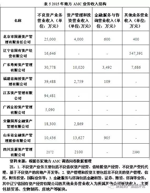 可以看到各地方AMC開展的業(yè)務(wù)種類繁多,除去最基本的不良資產(chǎn)處置業(yè)務(wù)外,多數(shù)地方AMC還選擇開設(shè)相關(guān)法律咨詢業(yè)務(wù)以及投資融資等業(yè)務(wù)。一方面,這是出于支撐不良資產(chǎn)處置業(yè)務(wù)的考慮;另一方面,開展其他金融服務(wù)業(yè)務(wù)能為自身帶來較高的收益。由于地方AMC所獲得的不良資產(chǎn)質(zhì)量相對(duì)較差,且處置方式受到較大的限制,導(dǎo)致不良資產(chǎn)業(yè)務(wù)收益不高(相對(duì)于四大AMC而言)。因此,多元化業(yè)務(wù)結(jié)構(gòu),滿足市場(chǎng)的潛在需求,從其他業(yè)務(wù)層面尋找利潤(rùn)增長(zhǎng)點(diǎn)成為了許多地方AMC的選擇。