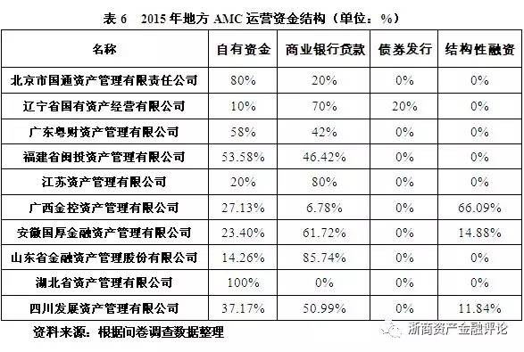 營(yíng)運(yùn)資金來源。除了股權(quán)資金以外,地方資產(chǎn)管理公司在具體項(xiàng)目運(yùn)作時(shí)的營(yíng)運(yùn)資金目前仍主要來自自有資金、政策性銀行及商業(yè)銀行貸款,其次是債券發(fā)行、結(jié)構(gòu)性融資等。部分地方AMC可以從集團(tuán)借款,但占比較小。表6是根據(jù)問卷對(duì)已有資產(chǎn)項(xiàng)目運(yùn)作的地方AMC運(yùn)營(yíng)資金來源的統(tǒng)計(jì):