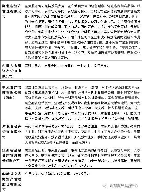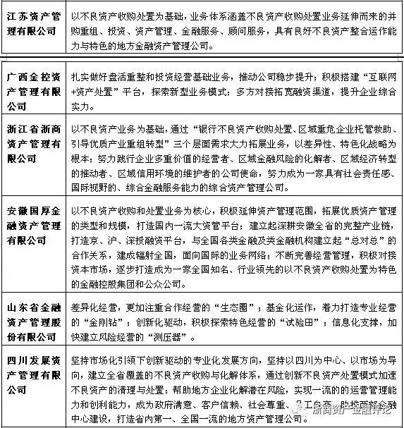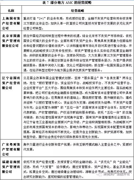 從整體上來看,地方AMC圍繞著不良資產(chǎn)處置這一基礎(chǔ)業(yè)務(wù)開展了多種相關(guān)業(yè)務(wù),通過設(shè)立基金、不良資產(chǎn)證券化、債轉(zhuǎn)股和并購重組等方式對(duì)不良資產(chǎn)處置鏈進(jìn)行挖掘。而從業(yè)務(wù)拓展上升到戰(zhàn)略層面,各地方AMC也都在積極的整合當(dāng)?shù)刭Y源,與地方政府、銀行和其他金融機(jī)構(gòu)尋求合作,并根據(jù)地緣特征和相關(guān)的股東背景,發(fā)掘區(qū)域內(nèi)潛在的市場(chǎng)需求,開展“區(qū)域?qū)?rdquo;業(yè)務(wù),形成自身的業(yè)務(wù)特色。部分地方AMC的經(jīng)營(yíng)戰(zhàn)略如表7所示。