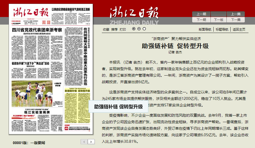 這是浙商資產(chǎn)支持實體經(jīng)濟(jì)轉(zhuǎn)型的眾多案例之一。自成立以來,該公司在8年間已累計為245家市場主體提供幫扶服務(wù),涉及相關(guān)金額近1200億元,穩(wěn)定了10萬人就業(yè)。尤其是新冠肺炎疫情發(fā)生以來,浙商資產(chǎn)支持57家實體企業(yè)轉(zhuǎn)型升級。