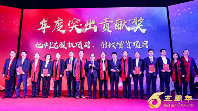隨后,在熱烈的掌聲中,2018年度浙商資產(chǎn)突出貢獻(xiàn)獎(jiǎng)獲獎(jiǎng)團(tuán)隊(duì)——億利達(dá)項(xiàng)目團(tuán)隊(duì)和引戰(zhàn)增資項(xiàng)目團(tuán)隊(duì)相繼站上舞臺(tái),孫建華董事長(zhǎng)、集團(tuán)其他領(lǐng)導(dǎo)、浙商資產(chǎn)董監(jiān)高等為獲獎(jiǎng)人員頒發(fā)獎(jiǎng)杯并留影,以表彰兩支隊(duì)伍在過去一年中為浙商資產(chǎn)開啟產(chǎn)融協(xié)同新格局和多元化股東新時(shí)代做出的突出貢獻(xiàn)。