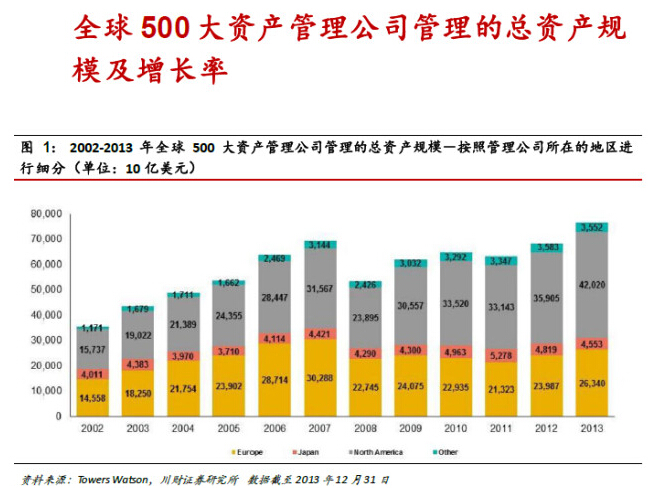 1.關(guān)于全球500 大資產(chǎn)管理公司:1)截至2013 年年底,全球500 大產(chǎn)管理公司管理的總資產(chǎn)規(guī)模達到76.5萬億美元,同比增長12.0%,首超過危機之前的2007 年的水平;2)其中北美地區(qū)的資產(chǎn)管理公司的規(guī)模是42 萬億美元,同比增長17.0%;歐洲為26.3 萬億美元,同比長9.8;日本為4.6 萬億美元,同比減少5.5%;3)超過6 成的資產(chǎn)由全球前500大資產(chǎn)管理公司管理。