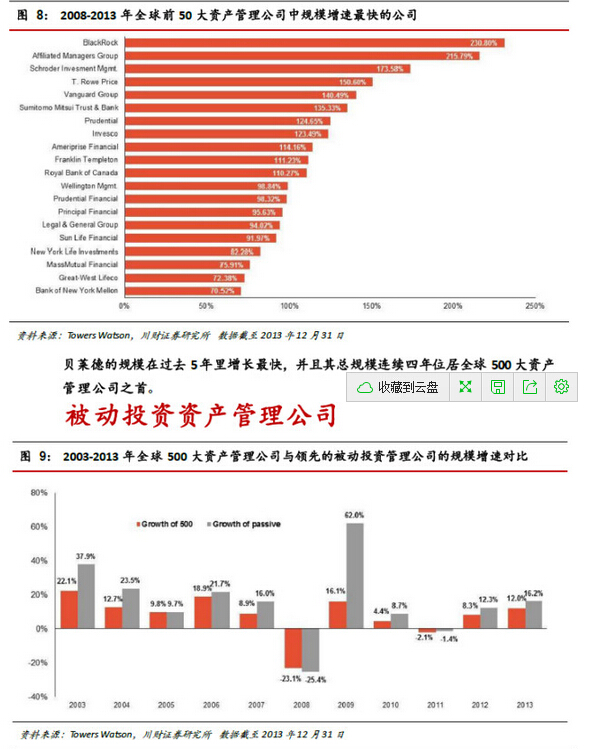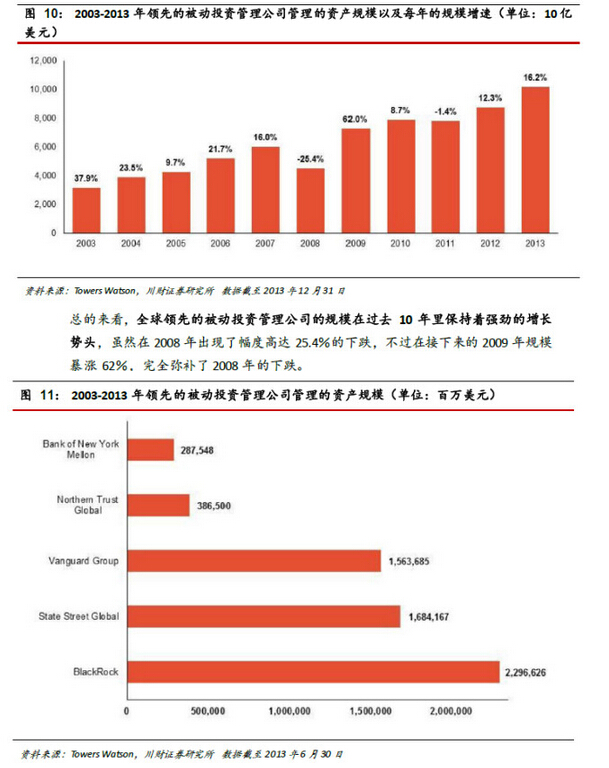 2.關(guān)于領(lǐng)先的被動投資資產(chǎn)管理公司:2003 年以來,領(lǐng)先的被動投資產(chǎn)產(chǎn)管理公司的規(guī)模增長迅速,年均復(fù)合增長率達到12.4%,而全球500大資產(chǎn)管理公司只有5.8%。