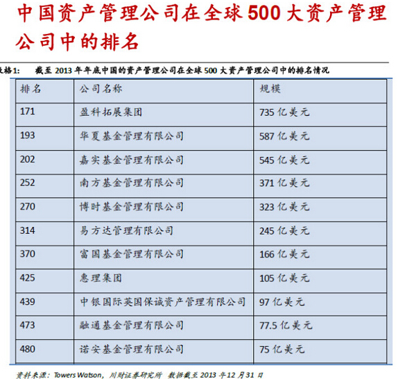 3.其它:1)截至2013 年年底,全球前20 大資產(chǎn)管理公司中有12 家自美國,8 家來自歐洲;絕大多數(shù)是銀行系和獨立資產(chǎn)管理公司,保險資產(chǎn)管理公司占少數(shù);2)中國大陸的資產(chǎn)管理公司只有華夏基金管理有限公司一家勉強進入前200 名,而巴西卻有4 家資產(chǎn)管理公司排在前100名以內(nèi),中國的資產(chǎn)管理行業(yè)潛力巨大且任重道遠。